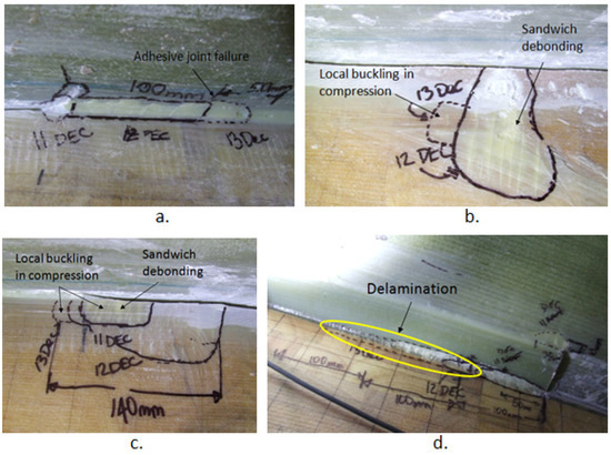 Damaged areas around the root: (a) delamination at 8.5 m (b) adhesive joint failure at 8.5 m; (c) delamination inside the web box at 9.5 m and (d) delamination inside the web box at 9.1 m.