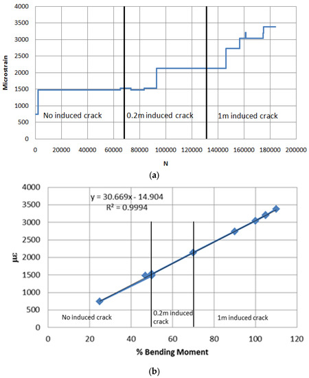 (a) SG2 reading versus number of cycles throughout fatigue testing and (b) Variation of SG2 strain versus BM loading throughout all three stages of fatigue testing.