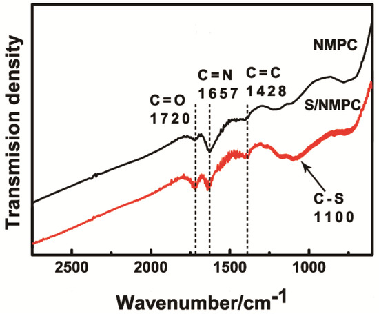 Figure 1 presents the FTIR spectra of NMPC and S/NMPC composite sample over the range of 2750–600 cm−1. The C=O and C=N stretching vibrations are found at 1720 cm−1 and 1657 cm−1. It has been widely reported that nitrogen doping not only enhances the conductivity of the carbon material, but also captures polysulfides by increasing the interface adsorption properties of the carbon material [29,30,31]. The peak at 1428 cm−1 can be ascribed to the C=C stretching [10]. The characteristic peak at 1100 cm−1 can be ascribed to the C–S stretching compared to the sample NMPC, revealing the chemical bonding between elemental sulfur and NMPC [32,33].