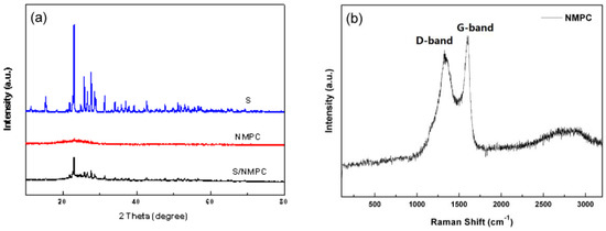 (a) XRD pattern of sulfur, NMPC and S/NMPC composite; (b) Raman spectra of as-prepared NMPC.