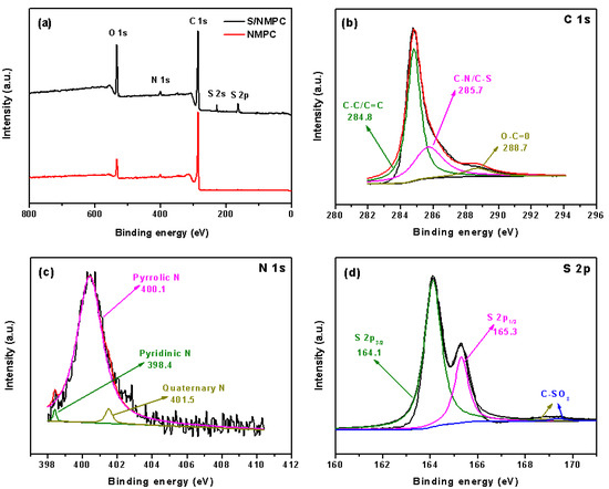 (a) Survey XPS spectrum of NMPC and S/NMPC composite; (b) C 1s; (c) N 1s; and (d) S 2p spectra of S/NMPC composite, respectively.