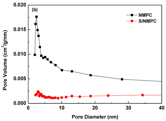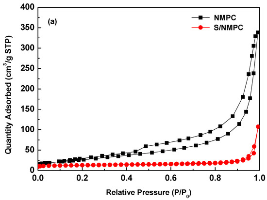 The N2 adsorption/desorption isotherms and pore-size distributions profiles of the NMPC and the S/NMPC composite are shown in Figure 4a,b, respectively. The N2 adsorption/desorption isotherm of NMPC exhibits a type IV isotherm, indicating the existence of mesopores. Moreover, the pore size distribution for NMPC declares the existence of mesopores, ranging from 2 to 40 nm in size, and the pore size distribution (PSD) was calculated by the Barrett–Joyner–Halenda (BJH) method using the adsorption isotherm. For the NMPC, its BET surface area and pore volume are 101 m2 g−1 and 0.54 cm3 g−1. The high BET surface area can serve as channels for the rapid transport of ions to insulating S8 and Li2S2/Li2S precipitates. After heat treatment, the specific surface area and pore volume of the S/NMPC has decreased significantly to 16 m2·g−1 and 0.16 cm3·g−1. Therefore, it is believed that sulfur has penetrated into the multiple pore structure and filled the mesoporous of the NMPC.