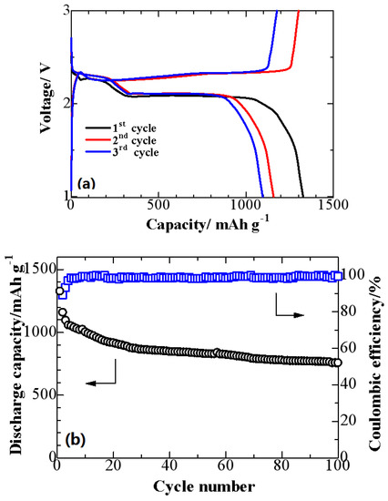 (a) Discharge/charge performance of a S/NMPC/Li cell at 25 °C at 0.1 C between 1 V and 3 V and (b) cycling performance and coulombic efficiency of a S/NMPC/Li cell at 25 °C at 0.1 C.