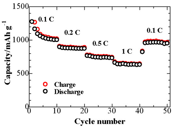 The rate capability of S/NMPC composite is shown in Figure 8. The stable specific capacities of S/NMPC composite at 0.1 C, 0.2 C, 0.5 C, and 1 C are 1025 mAh·g−1, 877 mAh·g−1, 743 mAh·g−1, and 642 mAh·g−1, respectively. Furthermore, the discharge capacity of 967 mAh·g−1 can still be obtained when the current density returned back to 0.1 C, indicating that the S/NMPC composite is highly robust and stable.
