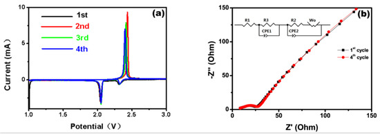 (a) CV curves of a S/NMPC/Li cell at 25 °C from first to fourth at a sweep rate of 0.1 mV·S−1; and (b) Electrochemical impedance spectra of a S/NMPC/Li cell at 25 °C after first and fourth discharge/charge cycle.