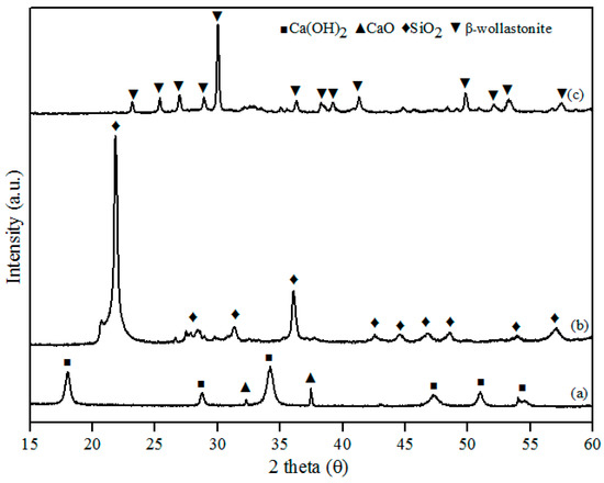 X-ray diffraction (XRD) patterns for (a) calcined limestone; (b) rice husk ash; and (c) β-wollastonite.