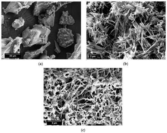 SEM micrographs of the calcined limestone at 1100 °C, as well as RHA and β-wollastonite sintered at 950 °C, are shown in Figure 2. Based on these micrographs, it can be seen that the RHA is of an irregular shape (Figure 2a), while the calcined limestone shows an irregular shape with a flaky structure (Figure 2b). However, after the sintering process, the β-wollastonite exhibited a dendrite-like structure (Figure 2c). It was expected that these samples would contain only β-wollastonite because the sintering temperature for β-wollastonite is from 870 to 1100 °C [23]. This result was definitely confirmed by the presence of intense peaks related to β-wollastonite.