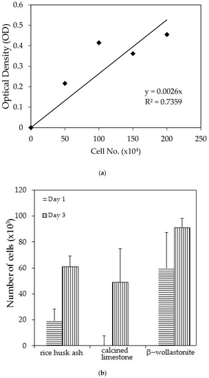 Before the cell viability test was carried out, disc shapes with radii of 10 mm and heights of 1 mm of the RHA, calcined limestone, and β-wollastonite samples were steam sterilized (120 °C, 20 min), referring to the method used by Swain et al. [42]. The cell viability test was evaluated by using PrestoBlue™ reagent as per standard protocol to assess cell viability. Human osteoblasts (differentiated from human mesenchymal stem cells) were seeded in the culture medium (Dulbecco’s modified eagle’s medium/nutrient mixture F-12 ham (FD); HEPES buffer solution 1 M in H2O from ThermoFisher, Scientific, Waltham, MA, USA; GlutaMAX™ (100X) from ThermoFisher, Scientific, Waltham, MA, USA; antibiotics and antimitotics; and fetal bovine serum (FBS); dexamethasone; beta-glycerophosphate; and ascorbate phosphate), which was cultured at a density of 200 k cells per 48-well culture plate and cultured in an incubator at 37 °C for one and three days to allow cell adhesion. The optical density of the solution was measured at 560 nm by an ELISA reader, and then the cell distribution and cell growth were calculated. The cell viability for each sample was performed with n = 3, and the difference in cell number and cell growth rate across was statistically analysed materials using the Kruskal-Wallis Test. Cells seeded on plastic culture dish surface were used as a control.