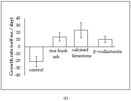 Cell viability test analyses show the; (a) reference curve for cell density on the culture dish; (b) cell distribution across different material discs; and (c) cell growth rates across the different material discs of rice husk ash, calcined limestone, and β-wollastonite powder samples for cell viability test.