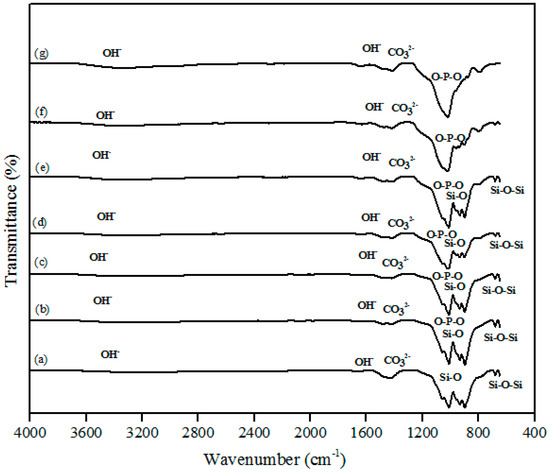 Fourier-transform infrared spectroscopy (FTIR) spectra of β-wollastonite (a) control sample and after soaking in the simulated body fluid (SBF) for (b) one; (c) three; (d) five; (e) seven; (f) 14; and (g) 21 days.
