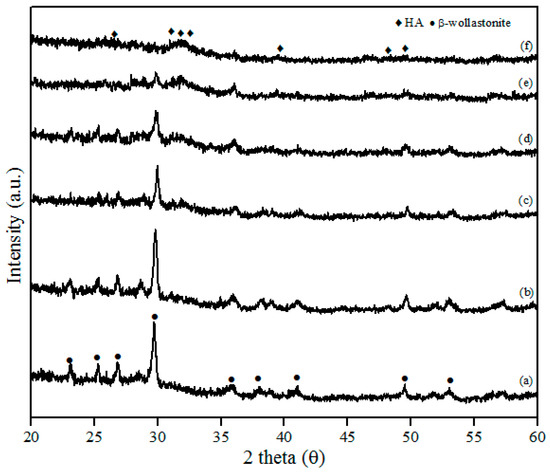 The XRD patterns of β-wollastonite before and after soaking in SBF solution are shown in Figure 6. These results indicate that the crystallinity of β-wollastonite decreased with increasing soaking period. The ACP layer was detected in the day 3 sample and almost covered the entire surface of the β-wollastonite, as shown in Figure 5c. A broad peak around 30.0° to 35.0 degrees in Figure 6c–e refers to an ACP structure [33]. This circumstance was confirmed by the decreasing peak of β-wollastonite at 30.0 degree, based on the XRD pattern (Figure 6a–f). Hydroxyapatite peaks (ICDD number 72-1243) start to form from the converted, unstable ACP structure. Referring to Figure 6f, no β-wollastonite or ACP structure peak was observed. The HA peak was detected within 21 days of soaking. The XRD pattern shows that β-wollastonite changes from a crystalline to an amorphous structure during the soaking period (Figure 6a–f).