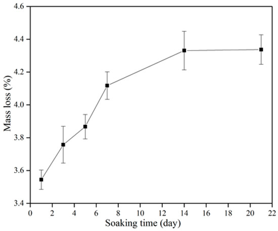 Figure 8 shows the degradation of the β-wollastonite in the SBF. The mass loss increased incrementally as a function of soaking time. The degradability value of the β-wollastonite sample reached 3.54% after one day of soaking. As the days of soaking increased, the degradation of mass slowly increased to 3.76% at day 3, 3.87% at day 5, 4.12% at day 7, 4.33% at day 14, and finally up to 4.38% by day 21. The increasing weight loss might have been caused by the dissolution of β-wollastonite powder when it released alkaline ions while soaking in the SBF solution, as similarly reported by Li and Chang [37].