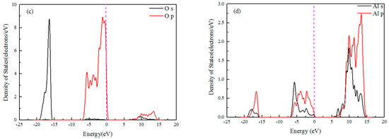 The band structure and density of states (DOS) of Al2O3 are shown in Figure 1. From the band structure of Al2O3 in Figure 1a, it can be seen that the top of the valence band and bottom of the conduction band meet at the G point with a direct band gap of 6.704 eV, which is consistent with the previous theoretical results [21]. However, this value is smaller than its experimental value of 8.8 eV due to the LDA underestimating short-range repulsive interaction. Figure 1b–d show that the valence band of Al2O3 has three regions. The lower region between −20 eV to −15 eV is attributed to the O 2s state, and the middle region is composed of O 2p states hybridized with Al 3s and 3p states. The upper region is composed of Al 3s, Al 3p, and O 2p states, while the Al 3s and Al 3p states mainly contribute to the conduction band. The above results depict that Al-O bonding in Al2O3 reveals strong ionic characteristics. This agrees well with previous calculated results of Al2O3 based on DFT computational methods [22], and proves that the LDA calculations could be used to study the surface of Al2O3.
