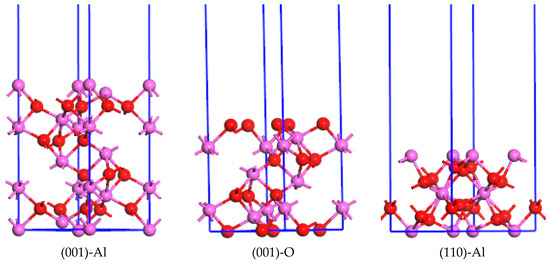 In order to determine the relative surface stability and the preferred orientation of Al2O3 under thermodynamic equilibrium conditions, the state of the surface energy of the crystals becomes very important. To simulate the surface energies of Al2O3, the slab model was used and the periodic boundary conditions were applied to the surface super cell under a vacuum region. The modeling of a slab of atomic layers is illustrated in Figure 2. The results showed that the vacuum layer is designed as 15 Å to avoid the interactions among periodic slabs of atomic layers. The unit cells of 1 × 1 are used for the low Miller index (i.e., (001), (110), and (113)) surface of Al2O3 in our calculations and modeling. For Al2O3 crystal, the surfaces of (001), (110), and (113) may be terminated and determined by Al or O layer. The atomic layers of 9 or 7 are used in the slab for the surface of Al2O3 here, as shown in Figure 2. The k-meshes of (001),(110), and (113) surfaces of Al2O3 in the calculations are 6 × 6 × 1, 4 × 5 × 1, and 3 × 5 × 1.