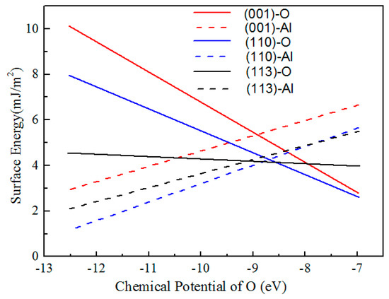 - Under oxygen-rich conditions, the surface energies of low Miller index surfaces of Al2O3 followed the sequence of (001)-Al > (110)-Al > (113)-Al > (113)-O > (001)-O > (110)-O. Under oxygen-deficient conditions, the sequence was converted to the trend of (001)-O > (110)-O > (113)-O > (001)-Al > (113)-Al > (110)-Al. The (001) surface possessed the higher surface energy.