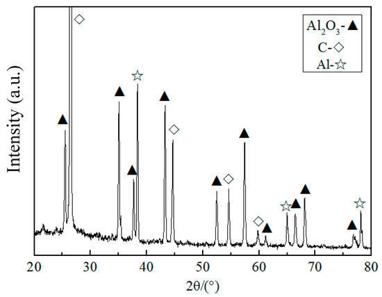 Equation (3) takes place on the interface of graphite-Al powders. The sub-oxide AlOx in the vapor state will continuously appear with the proceeding of the above reaction. Articles [23,24] also reported that the sub-oxide AlOx in the carbon thermal reaction could be generated. Then, the sub-oxide AlOx is oxidized to Al2O3 by oxygen in the Ar atmosphere, which forms Al2O3 nanocrystalline in the surface of the base crystal (shown in Figure 7c).