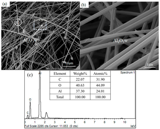 SEM images (a,b) and EDS spectrum (c) of the as-synthesized samples: Al2O3w means Al2O3 whiskers.