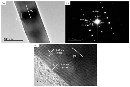 According to Equation (2), the angle of Al2O3 between the crystal face (113) and (110) is worked out to be 28°, consistent with the measured θ value in Figure 6b. So, the TEM analysis result confirms that the whiskers take on the Al2O3 phases. Furthermore, it can be seen in Figure 6b that the zone axis of Al2O3 whiskers is [110], the diffraction spots along the whisker’s axis is the crystal face (003), and its growth direction is parallel to [001], namely, along the c-axis. This analysis is in agreement with the calculation results of the surface energy, shown in Figure 2 and Figure 3. The HRTEM image of area 1 is shown in Figure 6c, which further proves that the Al2O3 whisker is a single crystal. The measured two lattice fringe spacing are 0.43 nm and 0.24 nm respectively, which are well matched with the (003) and (110) planes of the Al2O3 phases.