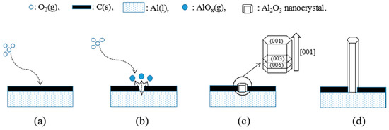 The generation mechanism of Al2O3 whiskers: (a) deposition of O2 on molten Al layer; (b) generation of AlOx(g); (c) growth on the direction of [001] and (d) the formation of Al2O3 whiskers.
