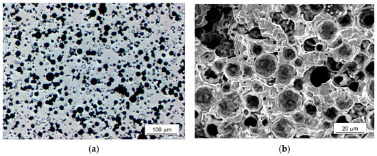 (a) Optical microscope image of the microstructure; (b) scanning electron microscope image of a freeze-fractured cross section of the iron syntactic foam with 5 wt % hollow glass microspheres.