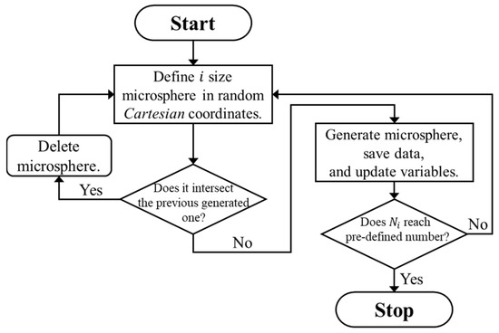 Schematic flow chart of the random sequential adsorption algorithm, where and are the diameter and the number of glass microspheres, respectively.