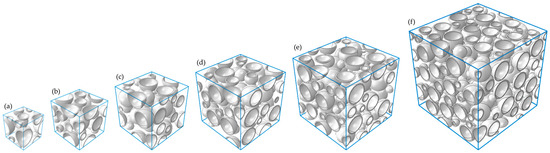 On the basis of the observed microstructures of the iron syntactic foam, three-dimensional cubic RVE models with edge lengths of 25, 35, 45, 55, 65, and 85 μm were generated. The hollow glass microsphere was idealized to consist of a perfect spherical pore and a shell with a constant thickness of 0.806 μm. Three different shell diameters of 8, 12, and 18 μm were introduced in order to take into account the variation in the shell thickness ratio in the models. The volume fraction of the microspheres was approximately 40.8% in all the models. The microspheres were inserted into cubical RVE boxes using the random sequential adsorption (RSA) algorithm [26]. The RSA algorithm involved adding the microspheres sequentially to the cubic volumes by randomly generating the center point of each microsphere. During the algorithm, if newly generated candidate microspheres overlapped with any previously generated ones, they were deleted. A 5% diameter of the microspheres was imposed as a minimum neighbor distance between each microsphere shell to overcome the practical limitations involved in creating adequate meshes in the matrix between the microspheres. A schematic flow chart of the algorithm is shown in Figure 2. In addition, the algorithm was modified to add the microspheres in order of diameter, from the largest to the smallest. For instance, if an initial algorithm for microspheres with a diameter of 18 μm was completed, then a new algorithm for microspheres with a diameter of 12 μm started. All procedures ended when the algorithm for the 8 μm diameter was completed. To avoid the wall effect, which refers to the inability of inclusions to penetrate through the sample boundaries [27], periodic microstructures were assumed. This was where the parts of microspheres intersecting boundary faces of the models were permitted to reappear through the opposite faces of the cubic volume. Three realizations were generated for each of the differently sized RVE models to investigate statistical errors of apparent responses between the models. Figure 3 depicts typical generated RVE models with different edge lengths. The RVE models with = 25, 35, 45, 55, 65, and 85 μm embedded 6, 12, 25, 50, 82, and 182 microspheres, respectively.