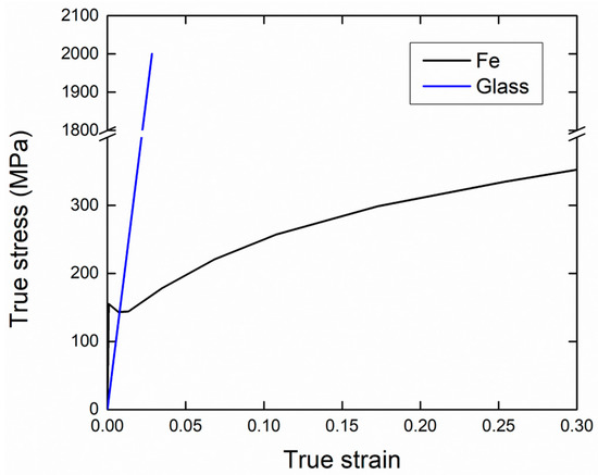 True stress–strain curves of the iron and glass [24,28] used for input data.