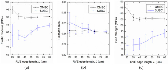 (a) Elastic moduli; (b) Poisson’s ratios; and (c) yield strengths obtained with the representative volume element (RVE) models subjected to different boundary conditions as a function of their edge lengths. Black lines with rectangular marks represent the orthogonal mixed boundary condition (OMBC). Blue lines with circular marks represent the static uniform boundary condition (SUBC).