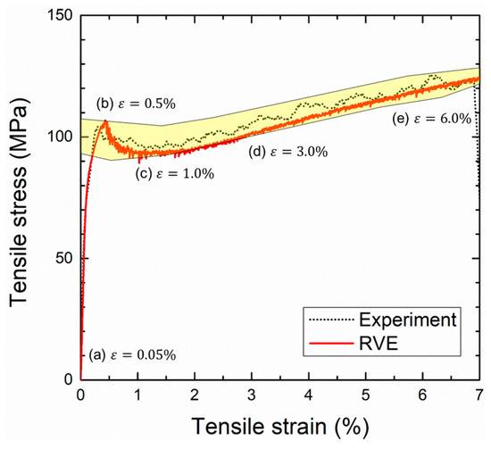 Typical stress–strain curves obtained by the experiment and representative volume element (RVE) model. The yellow-colored region indicates the deviation of the experimental results.