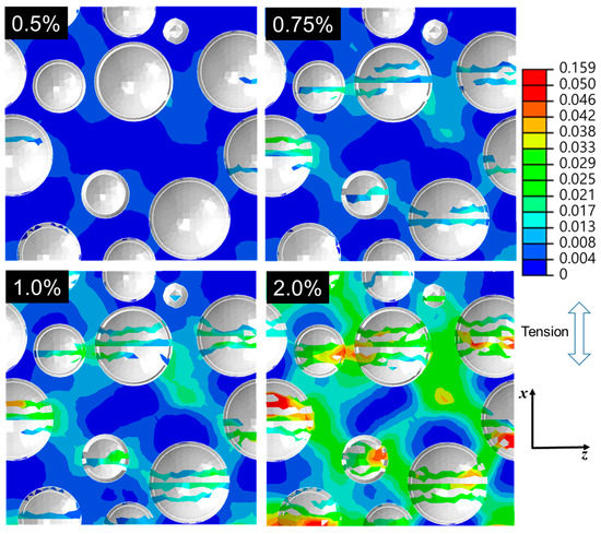 Plastic strain fields of a cross section of the = 55 μm RVE model subjected to x-axial tensile strain from 0.5% to 2.0%. The microspheres were colored in gray because no plastic deformation occurred.