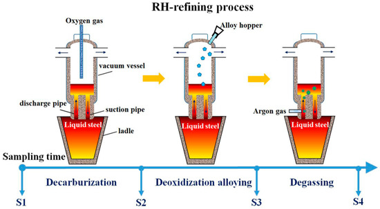 Silicon steel is a soft magnetic material that is widely used in the manufacture of electrical machinery, motors, and transformers [1]. Production of this low-carbon steel requires careful control of the oxide inclusions that occur during the steelmaking process [2,3,4]. One commonly used technique for refining low-carbon steels is the Ruhrstahl-Heraeus (RH) process [5,6,7]. The RH refining process has three stages: (1) decarburization, (2) deoxidization and alloying, and (3) degassing. During the first stage, oxygen is blasted into the melt to keep the carbon level low. The second stage has two aims: (1) to bring the oxygen level down before the processing continues, and (2) to ensure the proper combination of the additional elements introduced to form a new alloy. The third stage also has two aims: (1) to remove the hydrogen and nitrogen that had been naturally absorbed from the air during treatment prior to the RH process, and (2) to allow inclusions to float up into the slag.