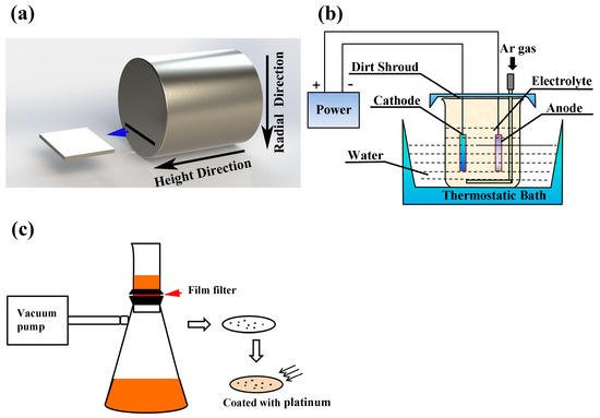 (a) Sheet cut from the ingot at the halfway point of the radius (“Height direction” and “Radial direction” are the vertical and horizontal directions of the RH ladle, respectively). (b) Schematic of non-aqueous solution electrolysis of a steel sample. The anode is a sheet cutting from the sample and the cathode is a platinum plate. (c) Collection of inclusions separated by vacuum filtration.