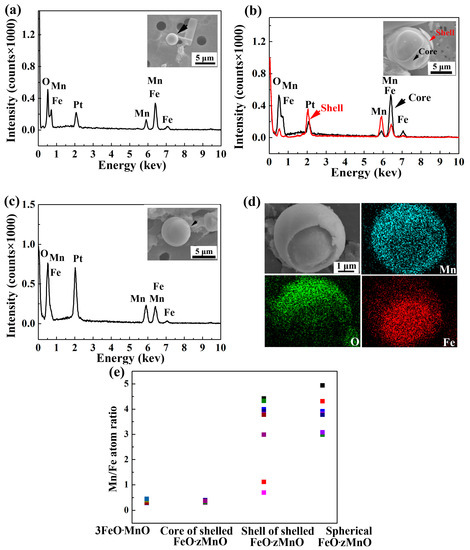 In sample S2, the ratio (z) of Mn/Fe in FeO·zMnO varies from 0.7 to 4 in shelled inclusions and from 3 to 5 in spherical FeO·zMnO. When z = 0.7, the composition is close to 2FeO·MnO. When z = 4, the composition is FeO·4MnO. This indicates that inter-diffusion occurred within the inclusions. The higher chemical potential of Mn in the oxide shell of S2 inclusions may have resulted in the diffusion of Mn from the shell into the inner core. Conversely, the higher Fe content in the core diffuses into the shell. When diffusion leads to z > 3, a distinct interface between shell and core disappears and spherical FeO·zMnO forms (see Figure 4).
