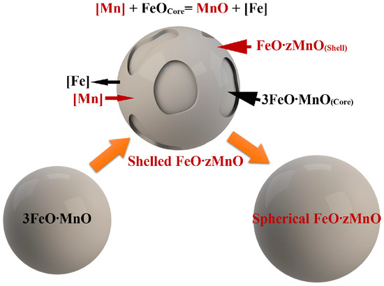 Schematic illustration of the evolution of MnO-FeO inclusions. Spherical 3FeO·MnO (left-hand) forms a molten-glass-like product before the melt reaches the solidification temperature. The center sphere is a shell-core inclusion formed by dissolved Mn diffusing towards 3FeO·MnO to nucleate FeO·zMnO shell on 3FeO·MnO. 3FeO·MnO forms the solid core after solidification, leaving a distinct shell-core structure.