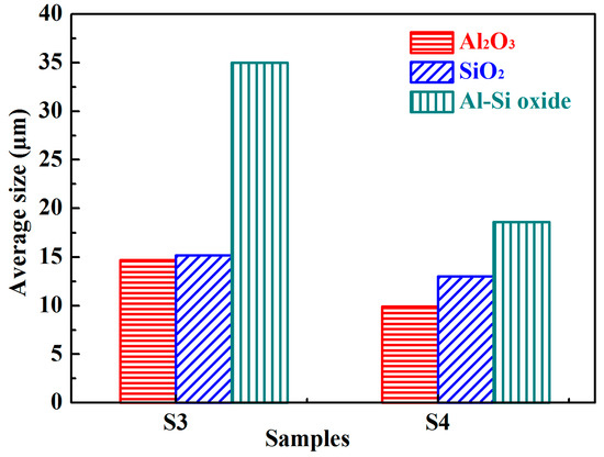 A decrease in size occurred between the second and third stages in all types of oxide inclusions (see Figure 6), because the larger inclusions had already floated into the slag.