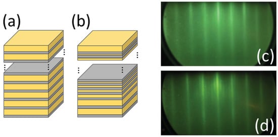 Schematic illustrations of Fe-Au (a) periodic multilayers (PMs) and (b) inverse Fibonacci-modulated multilayers (IFMs). The in-situ RHEED patterns of Au(100) plane (c) before and (d) after the deposition of Fe-Au IFMs.