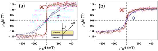 We measured the magnetic hysteresis loops of the multilayer samples using a vibrating sample magnetometer (VSM; BHV-525RSCM, Riken Denshi, Tokyo, Japan). The VSM measurements were carried out at room temperature. The dc magnetic fields up to 500 mT were generated using an electromagnet. The configuration is illustrated in the inset of Figure 2a. The in the magnetization measurements was applied in the perpendicular direction ( = 0) or parallel direction ( = 90) to the film surface. The angle-resolved FMR of the multilayer samples was investigated using an electron spin resonance spectrometer (JES-FA100N, JEOL, Tokyo, Japan) equipped with a TE011 cavity for the X-band (9.8 GHz) microwave. The FMR measurements were conducted at room temperature. The FMR spectra were measured at every 15, while the sample was rotated between = 0 and 180. The spectra between 45 and 135 were obtained in a magnetic field range between 100 and 500 mT, whereas the other spectra were obtained in a magnetic field range between 150 and 650 mT.