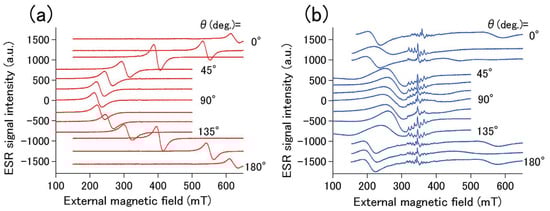 Resonance magnetic field and peak-to-peak linewidth are plotted as a function of magnetic field angle in Figure 4a,b, respectively. The PMs and IFMs samples correspond respectively to red circles and blue triangles. In Figure 4a, of the IFMs sample is fitted using the Kittel’s equation as