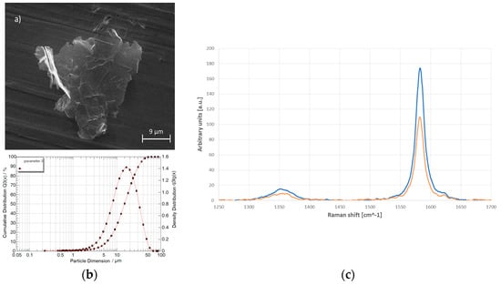 GnPs characterization: (a) SEM image of a single nanoplatelet of graphite; (b) particle size analysis of GnPs, as provided by the supplier; and (c) representative Raman spectra of GnPs before (blue line) and after (orange line) the electrodeposition process.