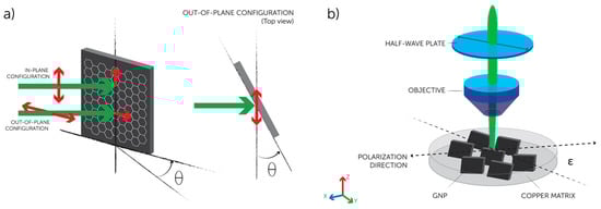 All GnPs spectra were excited with visible (532 nm) laser light and collected in the backscattering configuration. To study the disposition of the nanofillers, it was used a polarized laser beam in ‘VV’ configuration, where the polarization direction of the incident light is parallel to the scattered light. For a single GnP, Raman scattering is allowed for an in-plane polarization, but forbidden in the perpendicular polarization direction [44]. This means that the G-peak normalized intensity will have a maximum when the polarization is parallel to the crystal lattice and a minimum when the polarization is perpendicular to it [45,46]. The intensity of the Raman active modes can be calculated using the selection rules for light scattering in crystals [44,47]. During the evaluation of a carbon crystal alignment by polarized laser beam, we can have an in-plane configuration or an out-of-plane configuration. As shown in Figure 2a, when the laser incidence is not normal, but oblique with the crystal lattice, the electric field vector of the incident light can be fully contained into a graphene plane (in-plane configuration), or it can make an angle θ (out-of-plane configuration), depending on the polarization direction of the incident light [45]. Considering ε as the specimen rotation angle with respect to the polarization direction, for perfectly aligned GnPs (i.e., = = 0, respectively, the rotation angles of the x- and z-axis) the G-peak intensity has a maximum for the in-plane polarization (ε = 0, π, and 2π), while it is zero for ε = π/2, 3π/2. In our Raman experimental set-up presented in Figure 2b, the in-plane GnPs direction inside the matrix is oriented within the x-z-plane whereas the polarization is varied in the x-y-plane.