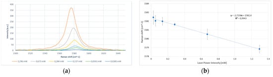 Phonons dependency with different laser power intensities. (a) The G peak region of the Raman spectrum from a single GnP recorded at six excitation power levels; and (b) the shift in G-peak spectral position due to change in total dissipated power. The spectra are excited at 532 nm and recorded at room temperature in the backscattering configuration.