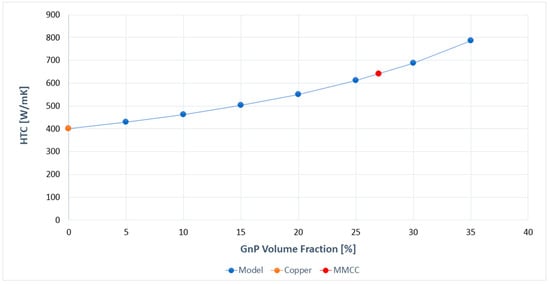 Calculated in-plane thermal conductivity enhancement for GnP-MMCC by the EMA model depending on the filler volume fraction in comparison with the experimental data obtained by the flash method.
