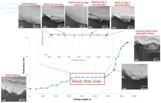 Relation between flank wear and cutting length for the uncoated carbide insert during machining AISI 304 stainless steel, combined with progressive Scanning Electron Microscopy (SEM) studies showing the Built-up edge (BUE) formation.