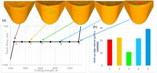 We have seen similar behavior in the steady state zone, as shown in Figure 3. The BUE is not stable at all: the build up forms, accumulates, and eventually breaks off, akin to an avalanche [], and then a new BUE is formed again. The instability of BUE may cause cracks and damage on the tool surface and eventually leads to a cutting edge break-out [], as it is shown in failure region (Figure 3) where a large sized build up is broken and it tears off the tool edge and results in a catastrophic failure of the cutting tool. The BUE is compressed from three sides, by the chip, the tool and the component being machined. These three forces balance each other and the BUE is held on the tool. The BUE is pressed against the tool so strongly that it sticks to it, forming a strong junction that is capable of removing chips. Under an excessive pressure, the BUE becomes so work hardened that it cut the material from which it has been produced instead of the tool and in this way it prevents the tool from wear []. Figure 4a shows the real 3D images of cutting tool profiles obtained with the Alicona microscope where the shapes of BUE at different cutting lengths through the steady state zone can be seen in orange and the associated values of BUE volume are shown in Figure 4b.