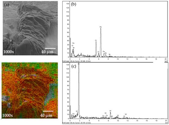 (a) SEM image of BUE region; (b) Energy-dispersive X-ray spectroscopy (EDS) spectrum analysis of the BUE zone on the rake face; (c) EDS spectrum analysis of the tool surface; and (d) color map of the Fe and Cr elements on the BUE region.