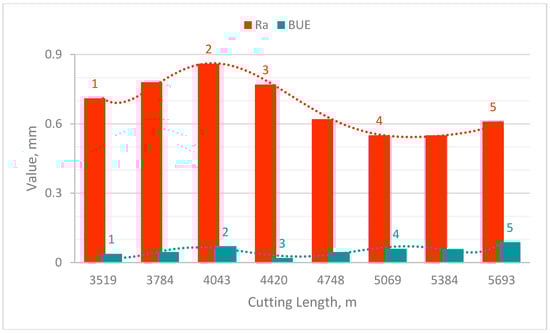 1. At the beginning of the steady state zone (from point 1 to point 2), BUE is continuously growing and engaging the machined surface, leading to the production of deep grooves, lowering the quality of surface finish (see point 2 in Table 4). When the BUE reaches a certain size, it tears off and new BUE is formed.