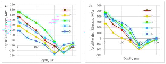 In depth residual stresses profiles for five selected points in the steady state zone in: (a) cutting direction; and (b) feed direction.