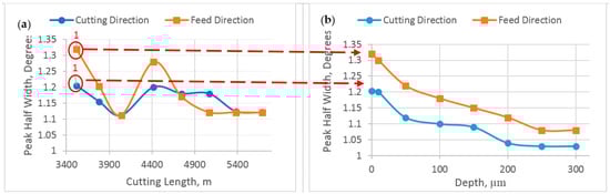 (a) Relation between Peak Half width and cutting length during steady state zone; and (b) in depth peak half width profiles in cutting and feed directions for the first point of steady state zone.