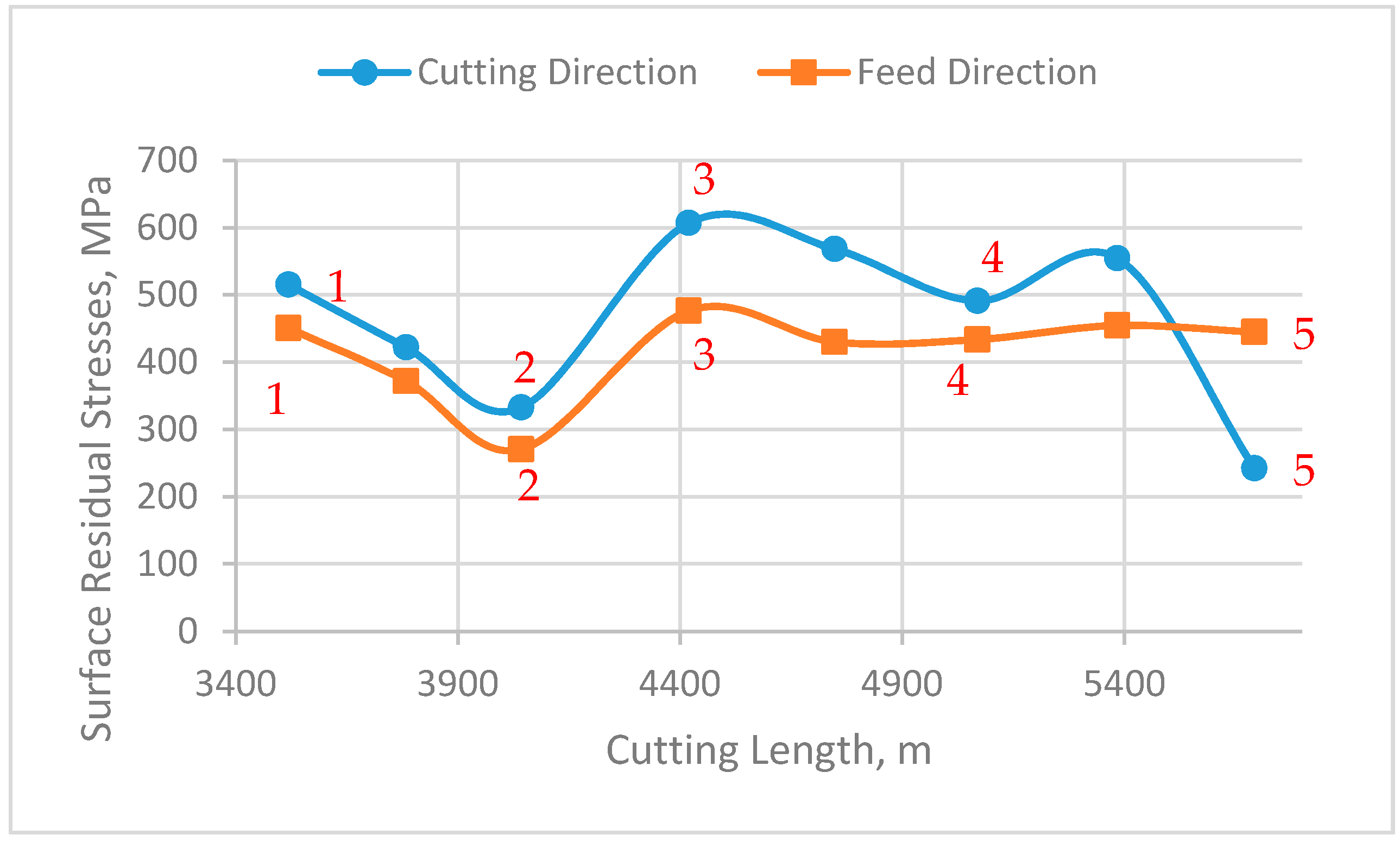 Residual stress profiles measured in the cutting and feed directions, respectively, are shown in Figure 9. It can be seen that tensile residual stresses at the near surface drop to compressive residual stresses within a shallow layer until a maximum compressive peak value is reached, and after that residual stresses are stabilized at a level corresponding to the state of the material before machining. In addition, it is observed from residual stress profiles in the cutting direction that the maximum residual stress and its depth are approximately the same for all selected points of steady state because all points have the same flank wear (stable state of wear).