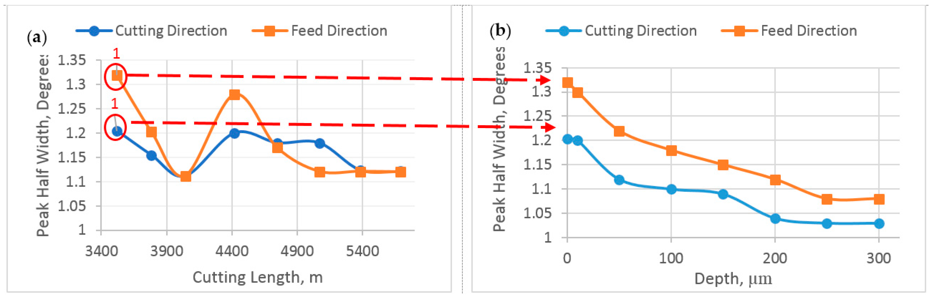 Figure 10b shows the in depth evolution of the peak half width in feed and cutting directions for one of the samples in the steady state zone (Point 1). As shown, the highest value of about 1.3° is measured directly at the surface, and this value decreases continuously to 1° for the unaffected workpiece. The depth at which the peak half width stabilizes corresponds to the thickness of the work hardening layer due to machining []. For all specimens, this layer was found to be around 250 µm. Peak half width profile was performed on all selected points of the steady state zone and similar results were observed.